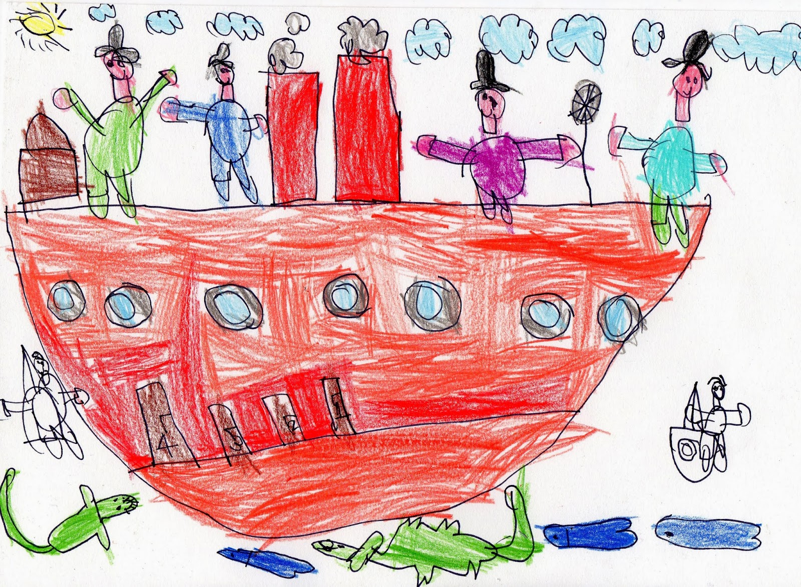 le aquile, uno squalo, due bimbi che giocano, il sole, un uccello, una casa e un albero